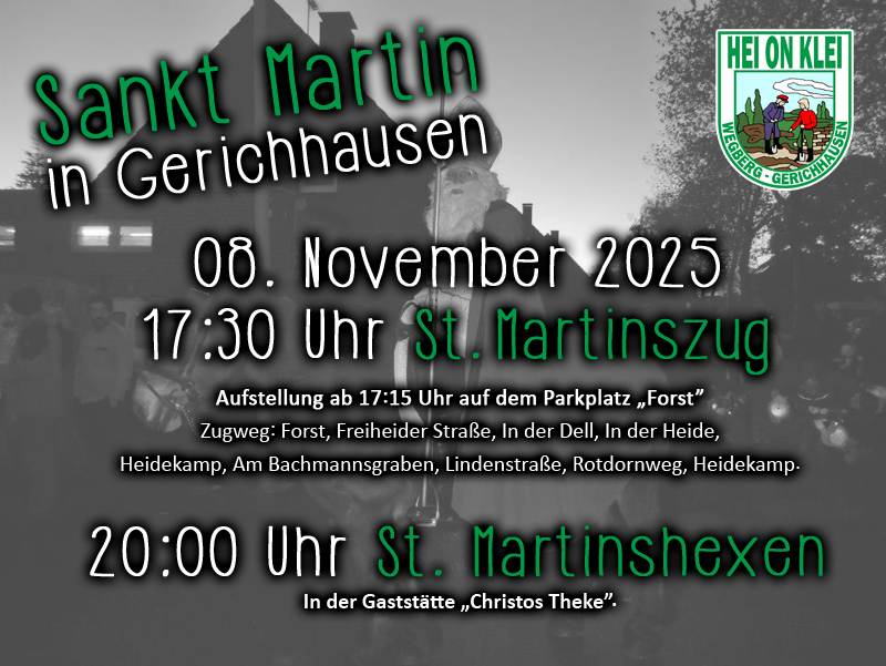 Der St. Martinszug in Wegberg-Gerichhausen findet am Samstag, den 08. November 2025, statt. Aufstellung ist ab ca. 17:15 Uhr und Zugbeginn um 17:30 Uhr auf dem Parkplatz „Forst“.